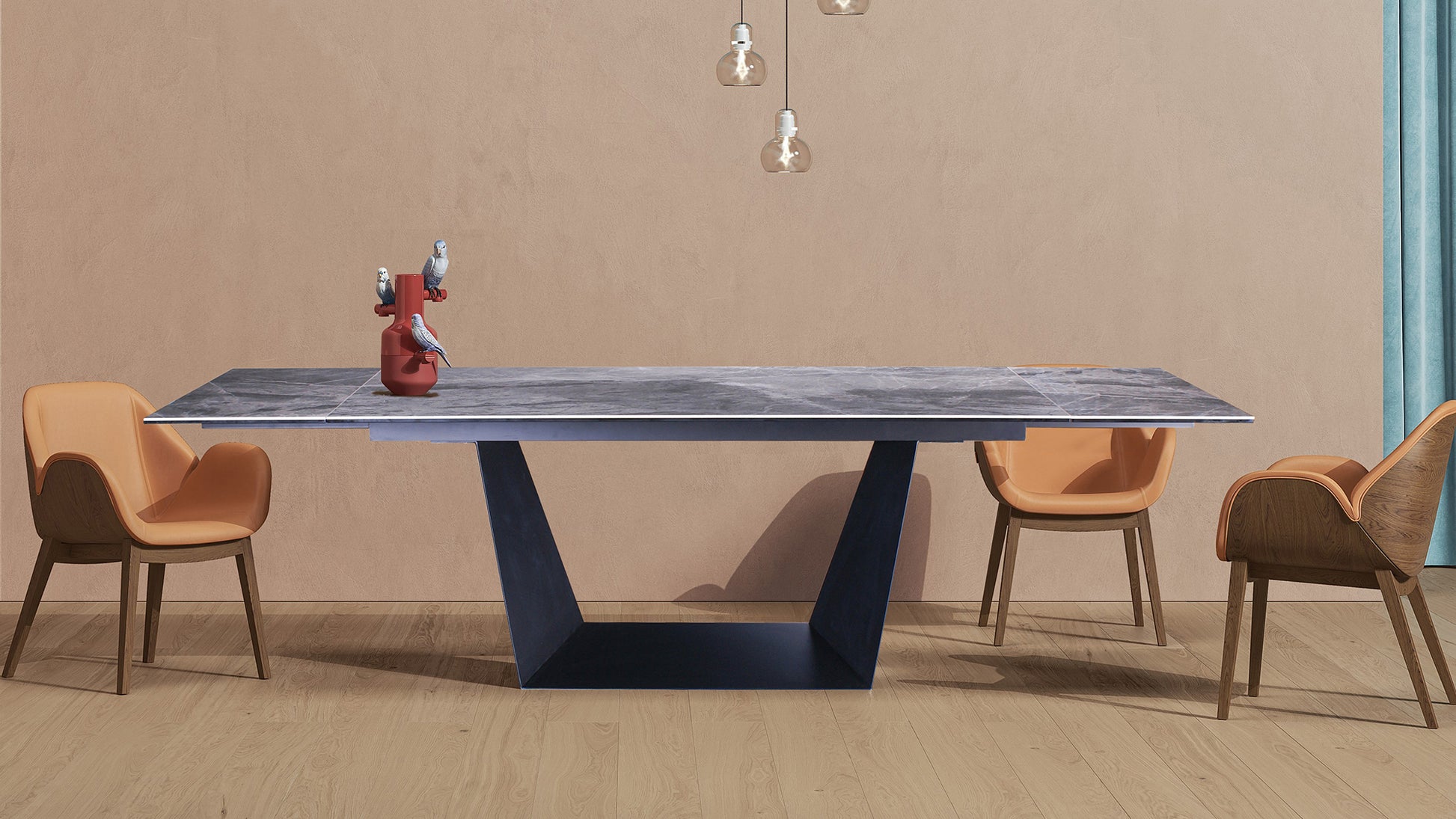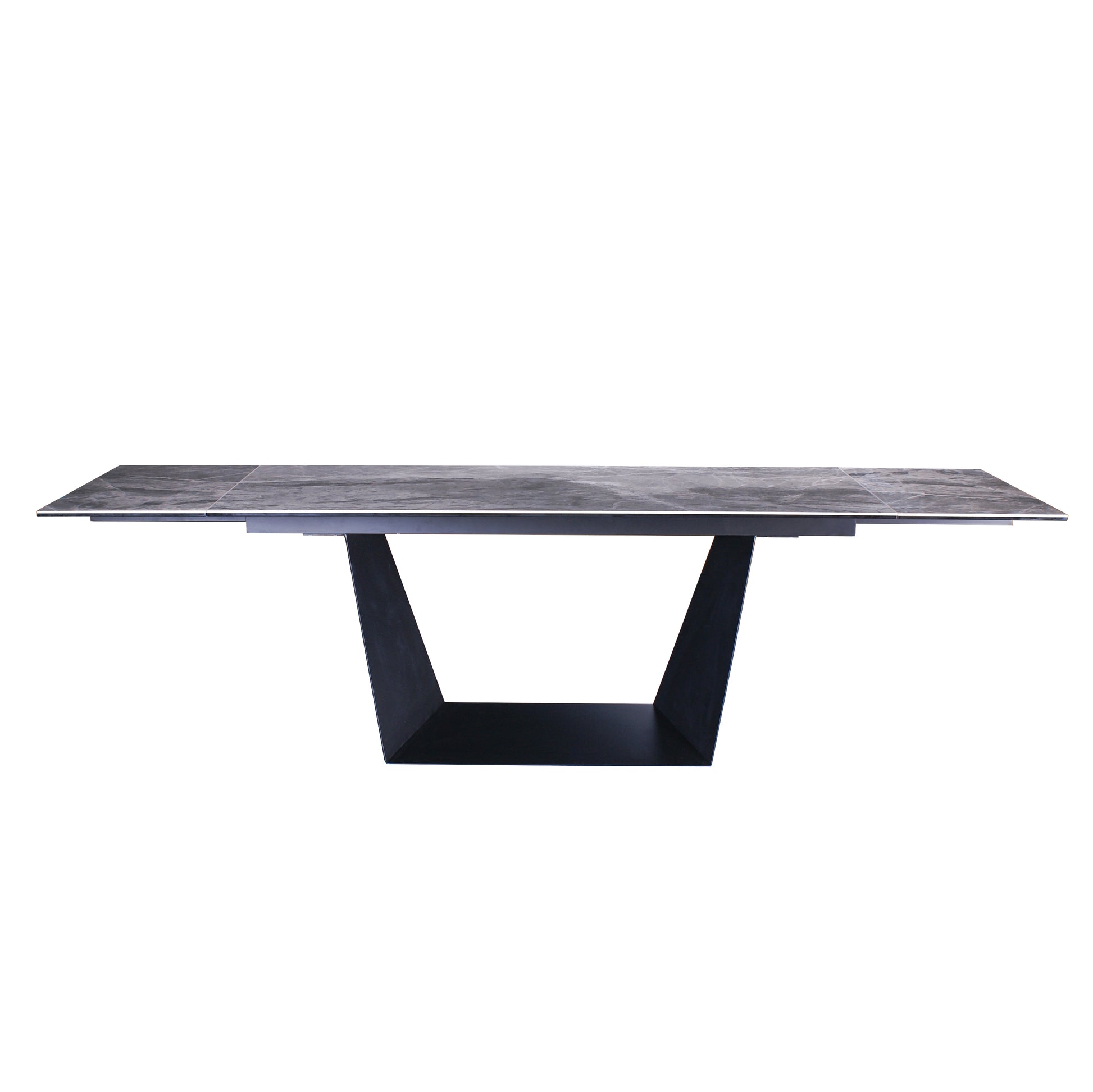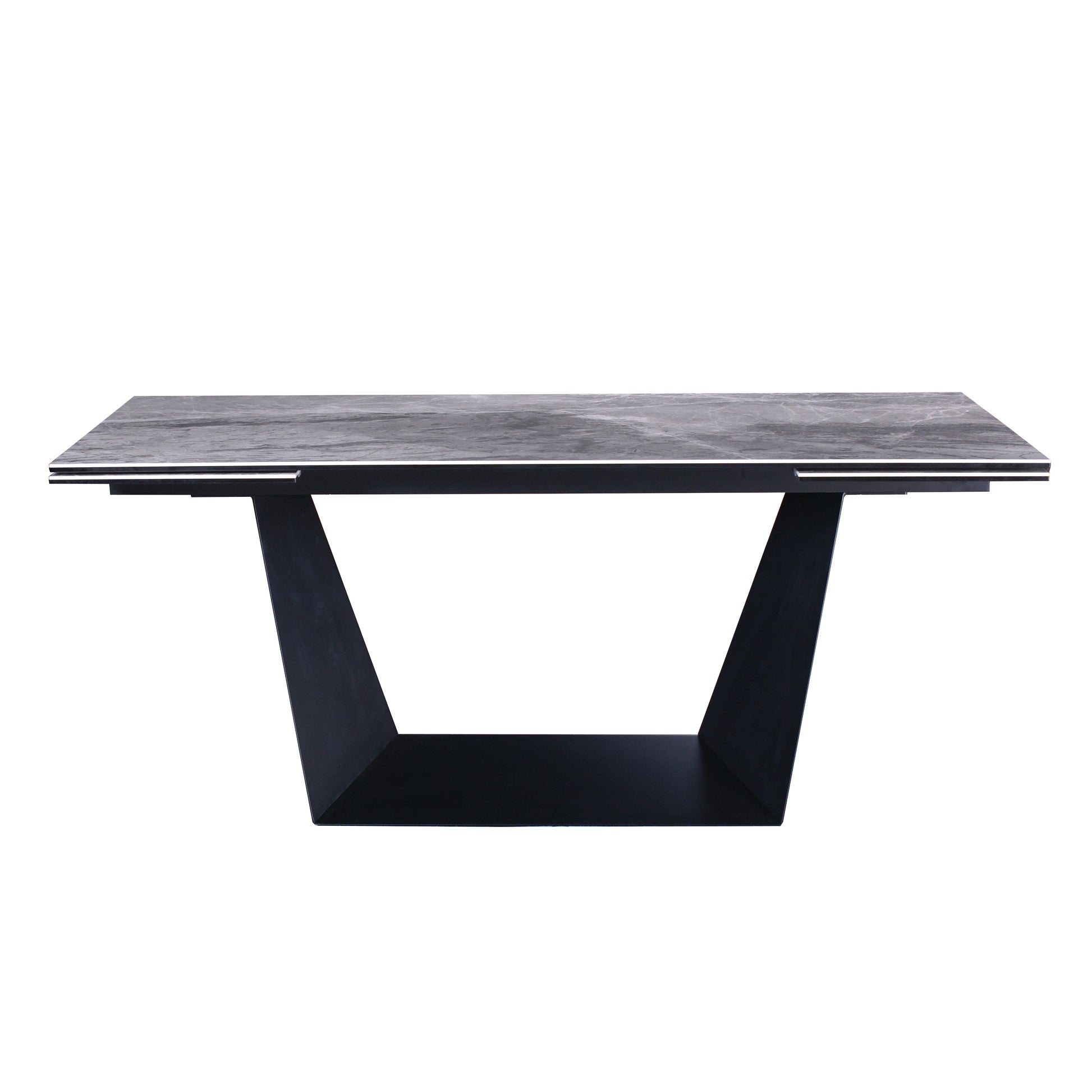 Bring modern sophistication and flexible functionality to your dining space with this extendable ceramic dining table. The marble-look ceramic surface is bonded to tempered glass for exceptional strength, offering superior resistance to heat, scratches, and everyday wear while maintaining an elegant stone appearance. Supported by a bold geometric black metal base, the table delivers both stability and sculptural style. Designed with two extension leaves, it easily expands to 106.3 inches to accommodate up to 10 guests, making it ideal for both daily dining and larger gatherings.