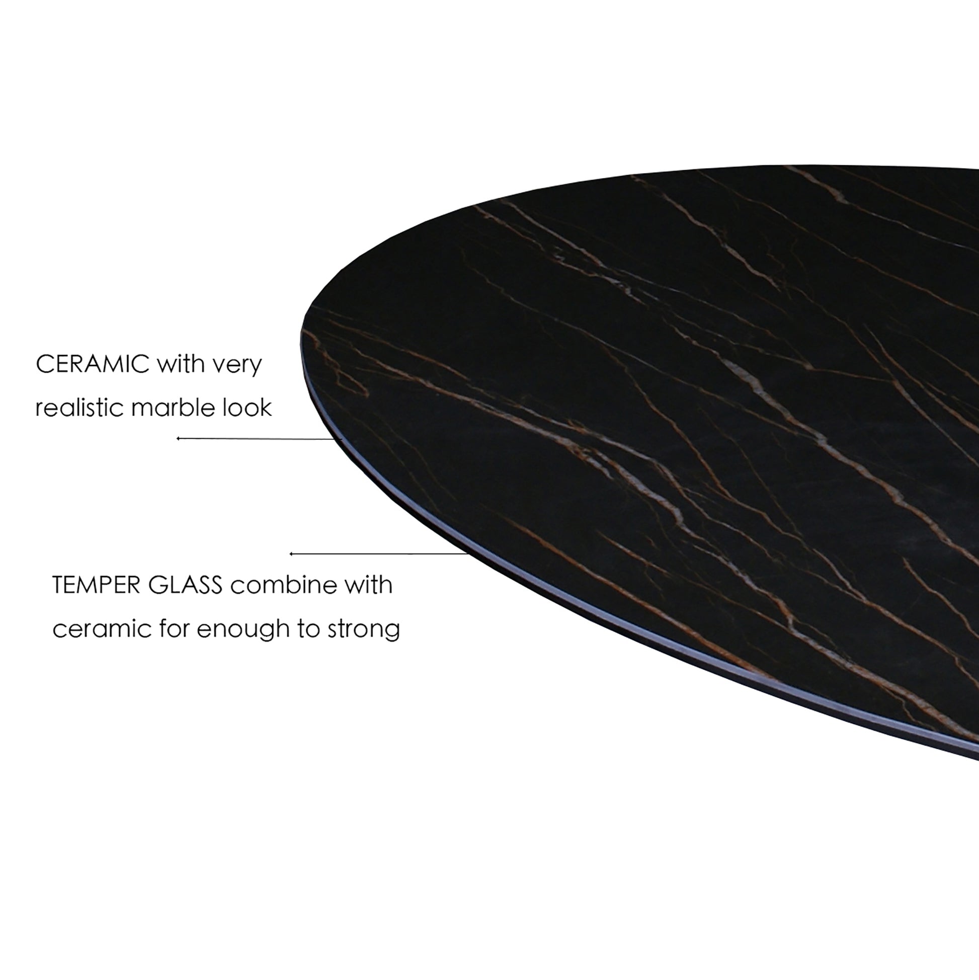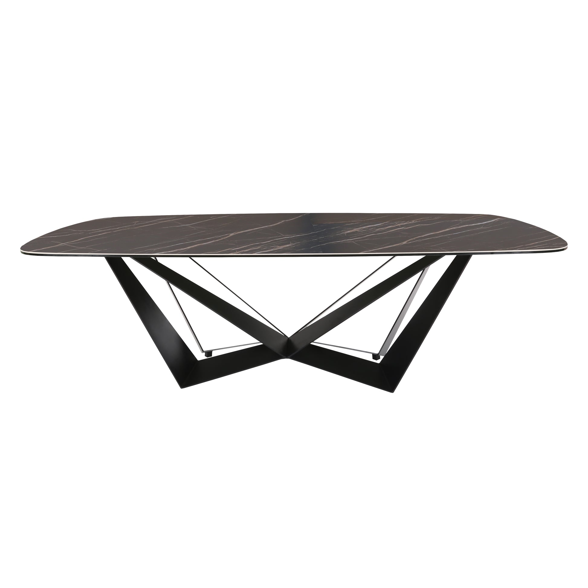 Elevate your dining space with this striking contemporary dining table, featuring a marble-look ceramic top fused with tempered glass for exceptional durability and refined style. The softly rounded rectangular silhouette offers generous seating while maintaining an elegant, modern profile. Supported by a bold geometric black metal base, this table delivers both architectural presence and everyday stability—perfect for modern dining rooms and open-concept interiors.